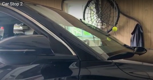 a ball is suspended on a string from the ceiling of the garage and the ball is set up to just barely touch the windshield of the car when it reaches it's park position. plus there is a side hook for temporarily removing the ball and then replacing when needed.